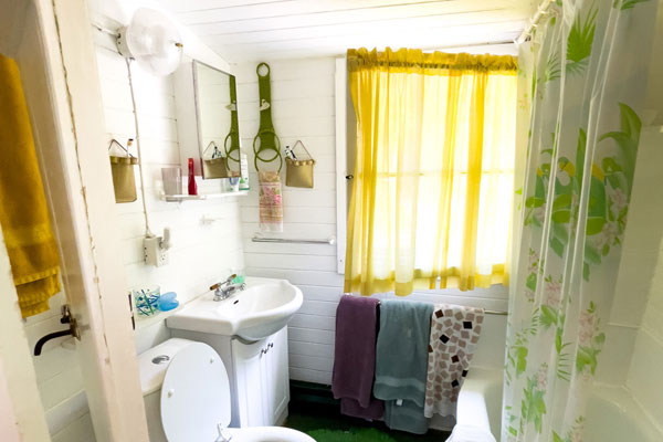 Small but tidy bathroom, with sink, toilet and full bath with shower wand for children or adults. For additional capacity, the public bath house is steps away on the boardwalk.