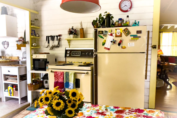 Kitchen area features Washer/Dryer and coffee station with side door leading to back deck dining area, with patio table and chairs for breakfast, lunch or cocktails.